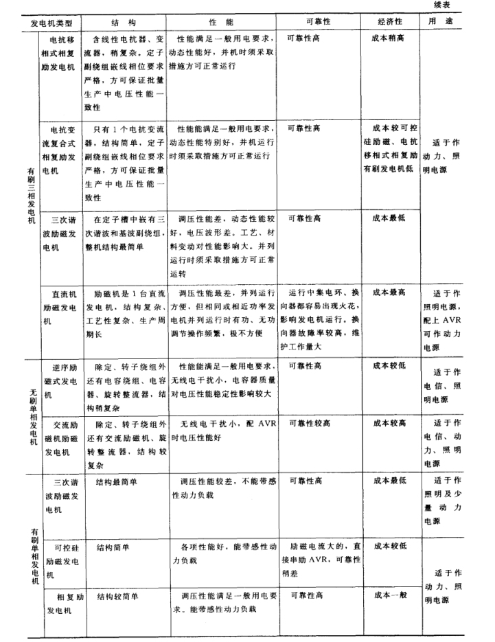 各類發電機的結構、基本性能、可靠性、經濟性、用途見表3-2。