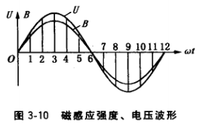 (2) 交流電的產(chǎn)生。交流電指的是大小和方向隨時間按正弦規(guī)律作周期性變化的電流或電壓。圖3-9所示發(fā)電機轉(zhuǎn)子順時針方向旋轉(zhuǎn),當(dāng)磁極①、②這一對N、S極掠過定子繞組U1的導(dǎo)線時,該繞組導(dǎo)線感應(yīng)的電壓為:磁極①極性為N,當(dāng)極弧表面上的點1、2、3三 個位置先后掠過繞組U1時,該繞組感應(yīng)電壓方向用右手定則判定為正;磁極②極性為S, 當(dāng)極弧表面上的點4、5、6三個位置先后掠過繞組U1時,該繞組感應(yīng)電壓方向用右手定則判定為負(fù)。由于磁極鐵心極弧表面與定子鐵心之間的氣隙大小設(shè)計成不均勻,中央氣隙小, 兩側(cè)氣隙大,通過氣隙大小和極靴寬度的合理選取,使沿極弧表面各處的磁感應(yīng)強度按正弦曲線分布。當(dāng)磁極的不同點掠過繞組U1時,該繞組感應(yīng)的電壓大小也按正弦曲線分布,如圖3-10所示,這就是單相交流電。交流發(fā)電機的轉(zhuǎn)速、磁極對數(shù)和感應(yīng)的 交流電頻率之間的關(guān)系式為:?=Pn/60 (式中?為交流電頻率,n為轉(zhuǎn)速,P為極對數(shù))。在圖3-9中一個N極和一個S極組成1個極對數(shù),該發(fā)電機為4極,即2 對極。
