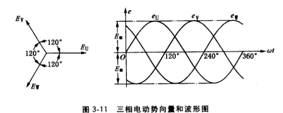 (3) 三相交流電的產(chǎn)生。圖3-9所示發(fā)電機定子鐵心梢中,沿圓周均勻安置彼此相隔 120°電角度的3個相同繞組U1U2、V1V2、W1W2,稱為三相繞組。當(dāng)轉(zhuǎn)子旋轉(zhuǎn)時,便可在三相繞組中感應(yīng)出彼此相隔120°電角度的交流電動勢印、eu、ev、ew,其向量和波形如圖3-11 所示。