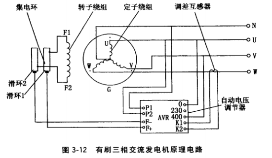 (4) 整機工作原理。有刷三相交流發(fā)電機原理電路如圖3-12所示。由勵磁電源輸出的直流電(勵磁電源可來自直流勵磁機發(fā)出的直流電壓、交流勵磁機發(fā)出的交流電經(jīng)整流成的直流電壓、定子副繞組感應(yīng)的電壓經(jīng)整流成的苜流電壓、定子主繞組抽頭電壓經(jīng)整流成的直流電壓),經(jīng)滑環(huán)、集電環(huán)向轉(zhuǎn)子磁極繞組F1F2提供勵磁電流。發(fā)電機由內(nèi)燃機驅(qū)動至接近額定轉(zhuǎn)速,依靠轉(zhuǎn)子磁極鐵心的剩磁磁場(新機或經(jīng)大修的舊機須經(jīng)充磁后,磁極鐵心才有剩磁磁場〉,在定子繞組中感應(yīng)出交流電。由于定子槽中嵌人的繞組按三相布置,因而感應(yīng)出三相交流電壓。調(diào)節(jié)磁場變阻器或自動電壓調(diào)節(jié)器(AVR)的電位器,可使發(fā)電機空載電壓整定在額定電壓值。負(fù)載時,依靠自動電壓調(diào)節(jié)器對轉(zhuǎn)子勵磁電流進(jìn)行自動調(diào)節(jié),以維持發(fā)電機電壓恒定。未配備自動電壓調(diào)節(jié)器的,則依靠手動調(diào)節(jié)磁場變阻器對轉(zhuǎn)子勵磁電流進(jìn)行調(diào)節(jié),以維持發(fā)電機電壓接近額定值。