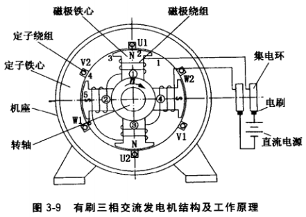 圖3-9是最簡單的4極交流三相發(fā)電 機工作示意圖。直流電源經(jīng)電刷、集 電環(huán)向磁極繞組提供直流電流(即勵磁電流),根據(jù)通電線圈周圍產(chǎn)生磁場的原理,4個磁極鐵心便建立起極性分別為N、S、N、S的磁場。定子 鐵心槽中分別嵌有U、V、W 三相定子繞組。發(fā)電機轉(zhuǎn)子由發(fā)動機驅(qū)動,由于電磁感應(yīng)作用,在定子繞組中便 感應(yīng)出電動勢,當(dāng)定、轉(zhuǎn)子鐵心尺寸和繞組匝數(shù)設(shè)計合理時,在額定轉(zhuǎn)速下發(fā)電機可發(fā)出額定電壓。