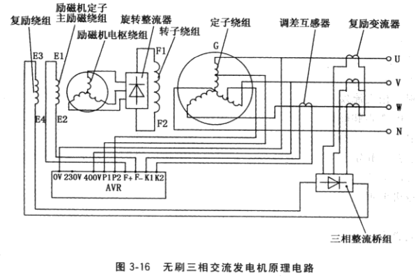 無刷三相交流發(fā)電機整機原理電路如圖3-16所示。發(fā)電機由內(nèi)燃機驅(qū)動旋轉(zhuǎn)至接近額定轉(zhuǎn)速,依靠轉(zhuǎn)子磁極鐵心和交流勵磁機定子磁極鐵心的雙重剩磁場,嵌在定子鐵心槽中的副繞組(或主繞組抽頭)感應(yīng)出電壓,并經(jīng)AVR中的整流環(huán)節(jié)整流后,輸人交流勵磁機定子繞組,建立交流勵磁機磁場。交流勵磁機電樞三相繞組便感應(yīng)三相交流電壓,該電壓經(jīng)旋轉(zhuǎn)整流器整流成直流電壓,輸人轉(zhuǎn)子磁極繞組,建立發(fā)電機主磁場,使發(fā)電機定子繞組感應(yīng)三相電壓,輸出三相電能。調(diào)節(jié)AVR中的電位器,可把機端電壓整定在額定值。負載時.,由AVR自動讕節(jié)發(fā)電機勵磁電流,以維持發(fā)電機電壓恒定。