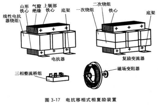 這種發電機是在圖3-4所示有刷三相交流發電機基本結構的基礎上,配置電抗移相勵磁裝置(見圖3-17) 而成,其中包括可調氣隙的線性電抗器、復勵變流器、三相整流橋組、 可調變阻器及過電壓阻容保護元件。