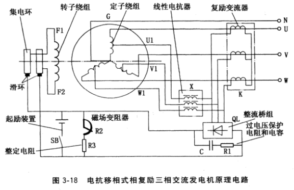 不可控電抗移相式相復勵三相交流發電機原理電路如圍3-18所示。線性電抗器接于發電機定子三相繞組抽頭U1、V1、W1。由圖可知,由定子繞組抽頭電壓經線性電抗器提供交流側勵磁電流的電壓分量,發電機負載電流經復勵變流器提供交流側勵磁電流的電流分量,兩者經幾何合成,經整流橋組整流后向發電機轉子繞組提供勵磁電流.建立轉子主磁 場。線性電抗器的作用是使由它提供的電流分量的相位移后端電壓約90電角度,由這個電流分量供給發電機空載時維持一定端電壓所需的勵磁電流。復勵變流器的作用是使由它提供 的電流分的相位與發電機負載電流相位相位相同,其數值與負栽電流呈線性關系,由它提供為補償負載時電樞反應的去磁效應所需的勵磁電流。