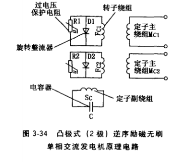 凸極式逆序勵磁無刷單相交流發電機整機原理電路如圖3-34所示。發電機由內燃機驅動至空載轉速,依靠轉子鐵心的剩磁磁場,定子副繞組Sc感應電壓,流過的容性電流產生單相脈動磁場。它可分解為順序和逆序兩個旋轉磁場,逆序磁場的旋轉速度與轉子轉速相等,但方向相反,在轉子繞組上感應出2倍發電機額定頻率的交流電流,經整流后向轉子繞組提供直流電流(勵磁電流〉,建立轉子主磁場;順序磁場旋轉速度與轉子轉速相等,且方向相同,對轉子主磁場起助磁作用。由于定子副繞組流過的是容性電流,容性電流的磁場對 轉子主磁場也起助磁作用。逆、順序磁場共同 作用,在定子主繞組上感應出空載電壓,實現 發電機自勵建壓。只要定、轉子各繞組參數設 計合理,在空載轉速下,定子主繞組感應的電 壓便可達額定值。定子主繞組Mc1,和Mc2串聯 時發電機輸出230V電壓,并聯時輸出115V 電壓。發電機負載時,其工作原理與隱極式逆 序勵磁單相交流發動機基本相同。