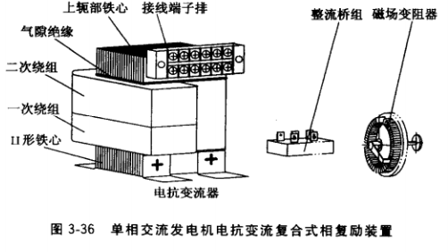 (2) 相復勵裝置。其外形、結構如圖3-36所示,它包括電抗變流器、單相整流橋組和磁場變阻器。作為可控相復勵裝置,還必須外配分流式自動電壓調節器。