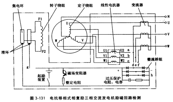 圖3-129中雙點劃線框內部分為這種發電機勵磁回路,它包括U相定子繞組、AVR (或整流橋組)、集電環、轉子繞組F1F2及各段連接線。