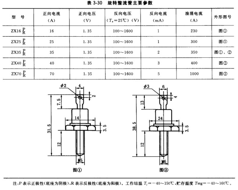 整流二極管有正、反極性兩種結構,正極性的底座為陽極,引線端為陰極,外殼上常用P代號標識;反極性的底座為陰極,引線端為陽極,外殼上常用R代號標識。圖3-153是正極性整流二極管外形及圖形符號。整流二極管簡易檢測方法: