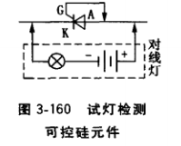 ②用對線燈檢測。如圖3-160所示,若將控制極G懸空,燈不亮,對換接線極性時,燈也不亮。然后將控制極G觸碰陽極A, —碰燈就亮,則說明該元件是好的,否則該元件已損壞,應更換。