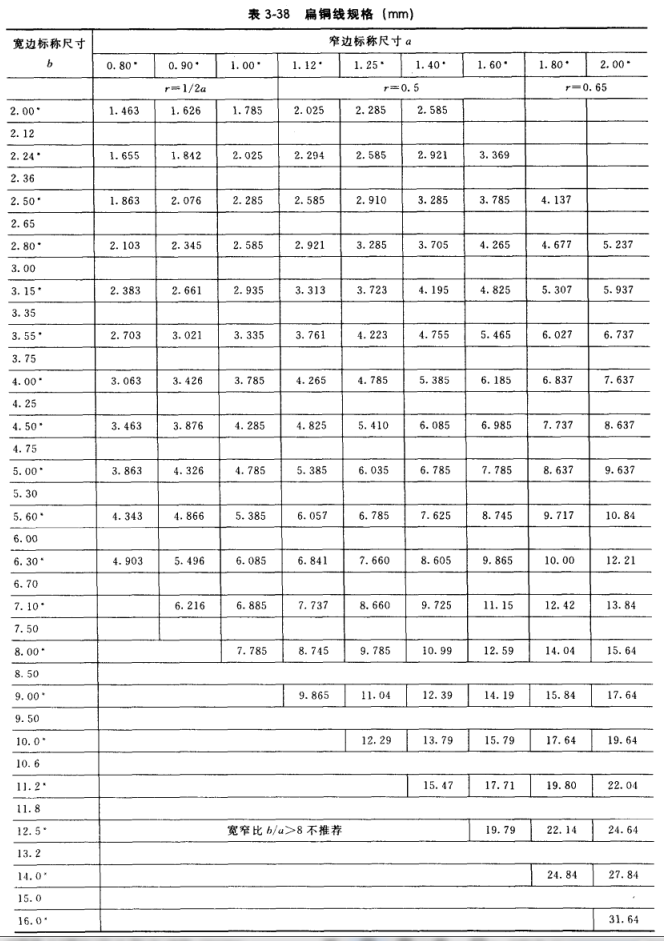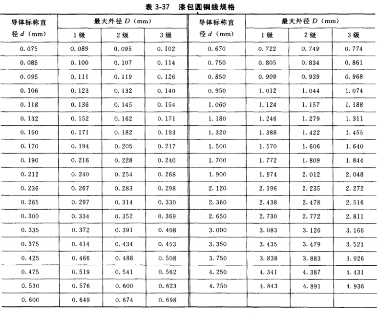 (2)繞組線規(guī)。中小型三相交流發(fā)電機(jī)定子繞組一般采用漆包圓銅線。修理時(shí)根據(jù)交流發(fā)電機(jī)的型號(hào)、規(guī)格,從相應(yīng)的表3-3?3-6中査找或采用實(shí)測法確定線規(guī)(若二者線規(guī)有出入時(shí)以實(shí)測線規(guī)為準(zhǔn),下同)。線規(guī)實(shí)測方法:從故障交流發(fā)電機(jī)定子槽中拆出一個(gè)線圈, 找到該線圈第一匝,用千分尺或游標(biāo)尺測量線徑(必須測量裸銅線直徑,而不是測量漆包線或絲包線外徑),若該線圈由多根線并繞,還必須測最其中不同線規(guī)線的直徑及根數(shù)。然后 根據(jù)修理該用的漆包線規(guī)格迸行采購。由于漆包線國家標(biāo)準(zhǔn)已更新,當(dāng)開列的漆包線規(guī)格在市場買不到時(shí),應(yīng)就近選用國家新標(biāo)準(zhǔn)規(guī)定的線規(guī),但線規(guī)截面積或多根并繞的總截面應(yīng)足 夠。現(xiàn)行國家標(biāo)準(zhǔn)規(guī)定的漆包圓銅線標(biāo)稱直徑見表3-37,扁銅線標(biāo)稱規(guī)格見表3-38。
