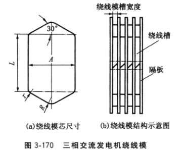 繞線模結(jié)構(gòu)見圖3-170b,繞線槽尺寸按上述計(jì)算值制作。繞線模由繞線槽和隔板組合而成,繞線槽數(shù)=q×連繞線圈組數(shù)(q為每個(gè)線圈組槽數(shù))。修理發(fā)電機(jī)用的繞線模宜就地取材用木板加工而成。繞線模中央開有方孔,方孔尺寸應(yīng)與繞線機(jī)上的方形軸尺寸相符。