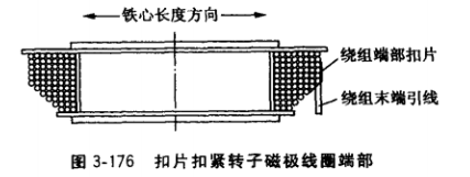 (1)分體凸極式轉子繞組繞制,把線圈框架裝夾在繞線機的繞線架上,按設計規定 或實測的每層排列匝數及層數繞線,排列應 整齊、結實,總匝數應正確,末匝應采用扣片扣緊(見圖3-176)。每個線圈繞線方向圖3-176扣片扣緊轉子磁極線圈端部應統一。