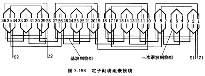 ②定子副繞組嵌線。定子副繞組一般均為單層疊式或單層同心式繞組,以圖3-87展開圖為例說明,其中三次諧波副繞組S1、S2、S3就是三相單層疊式繞組,基波副繞組Z1、Z2 是單相單層同心式繞組。