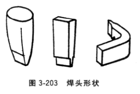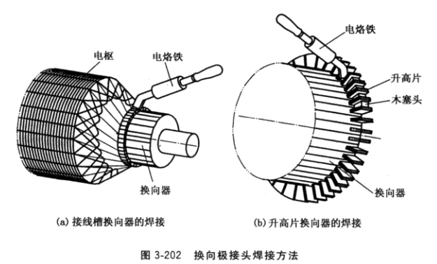 (2) 工藝準備。調整電樞接頭片之間距離。采用接線槽的換向器,應使接線槽垂直于換向器。采用升高片的換向器,升高片垂直于換向器且距離應均勻。在升高片之間通常要敲入梯形(退拔)木塞頭,使升高片之間一般保留1/3升高片的高度的空隙,以便放電烙鐵頭, 如圖3-202b所示。將換向器升高片的外端面圓周銼平、銼光,并立即涂以松香溶液,防止銅皮產生氧化膜。焊接時絕不能讓電樞繞組引線頭高出換向器接線槽(接線槽必須加工有足夠深度)。