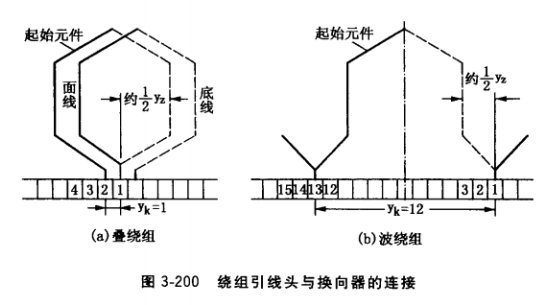 對單疊繞組換向器節(jié)距:yk = ± 1,兩引線嵌入相鄰兩換向片中。對單波繞組 yk= (k±1)/p(k為換向器片數(shù),p為主極對數(shù),±表示繞組為左行或右行)例如28槽4極單疊繞組,槽竹距yz = z/2p = 28/4 = 7 (即1?8),換向器節(jié)距:yk = +1。選擇某個元件作起始點,把它的底線引線頭接到距元件有效邊向內約yz/2處的換向片1上, 再按yk(1?2)將面線的引線頭連接到相鄰的換向片,如圖3-200a所示,其余元件依次類推。
