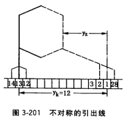 有時繞組的引線頭距離做成不對稱的,如圖3-201所 示,它的底線引線頭伸出長度比起一般的(見圖3-200b)長得多,這種繞組多用在四極勵磁機中,因4個主極在垂直及 水平線上,所以把電刷位置改在換向極的中心線以便通過后端蓋上窗孔進行觀察。