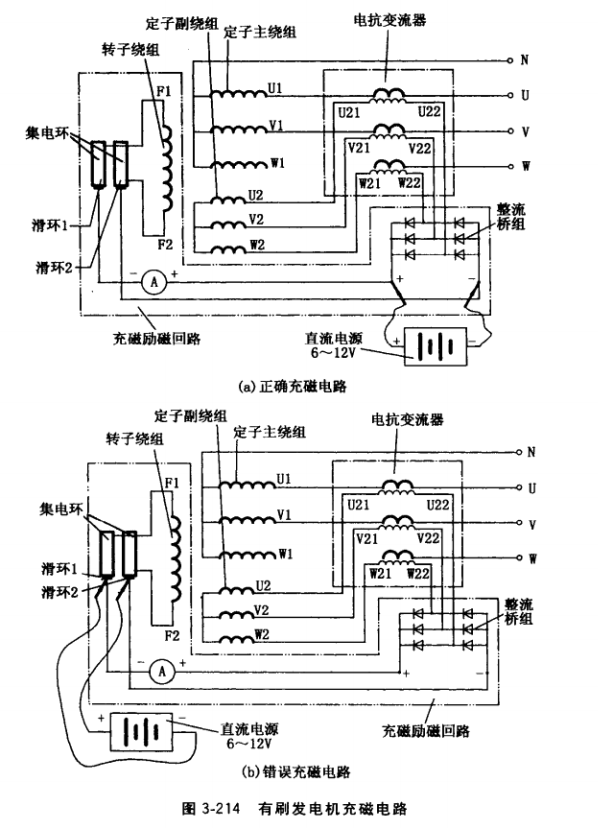 (2)兩種錯誤充磁方法。一是直流電源“+”極觸電刷、滑環(huán)2, “-” 極觸電刷、滑環(huán)1,見圖3-214b,此時直流電流表表針正向偏擺,若發(fā)電機有旋轉(zhuǎn),交流電壓表指示電壓上升,但充磁電源一脫離,發(fā)電機就隨之失壓。因為在這種情況下,充磁電源所激勵的勵磁電流方向與整流橋組輸出的勵磁電流方向相反,不可能維持發(fā)電機勵磁電流;二是直流電源 “+”極觸整流橋組“-”端,“-”極觸整流橋組“+”端,則表現(xiàn)為勵磁電流表表針反偏,交流電壓表指示電壓上升,但充磁電磁一脫離,發(fā)電機隨之失壓。因為在這種情況下, 充磁電源所激勵的勵磁電流方向也與整流橋組輸出的勵磁電流方向相反,不可能維持發(fā)電機勵磁電流。