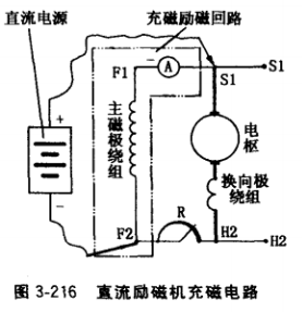 圖3-216中雙點劃線范圍為充磁勵磁回路,包括直流直 流電源 充磁勵磁回路電流表“ + ”端、“-”端、定子主磁極繞組。充磁前勵磁機充磁勵磁電路應(yīng)完好,勵磁機處于停機或運轉(zhuǎn)狀態(tài)。6?12V直流電源“+”極觸直流電流表“+”端,“-”極觸定子主磁極繞組“F2” 端,此時直流電流表表針正向偏轉(zhuǎn),說明定子主磁極繞組中有直流電流通過,完成充磁工作,即可脫離直流電源。有的勵磁機未裝勵磁電流表,且試驗臺上也未裝勵磁電流表,則最好在勵磁機旋轉(zhuǎn)情況下充磁,觀察交流電壓表有電壓指示,且脫離充磁電源后勵磁機能維持電壓,即完成充磁。若充磁直流電源“ +”、“-”極與定子繞組“F1”、“F2” 反接時,則直流電流表表針反向偏轉(zhuǎn),電樞感應(yīng)的電壓極性隨之改變,也就是勵磁機輸出電壓的“ +”、“-”端改變,影響勵磁機正常使用。