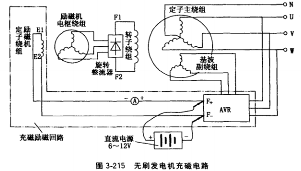 圖3-215中雙點劃線范圍為充磁回路,包括AVR自動電樂調(diào)節(jié)器輸出端“F+”、“F-”端、直流電流表、勵磁機定子繞組端點E1、E2。充磁前發(fā)電機充磁勵磁電路應(yīng)完好,發(fā)電機處于停機或運轉(zhuǎn)狀態(tài)。6?12V直流電源“+”極觸AVR的“F1”端(或“+”端), “-”極觸AVR的“F2” 端(或“-”端),此時直流電流表表針正向偏轉(zhuǎn),說明轉(zhuǎn)子繞組中有直流電流通過,完成充磁工作,即可脫離直流電源。有的發(fā)電機未裝勵磁電流表,且試驗臺上也未裝勵磁電流表,則最好在發(fā)電機旋轉(zhuǎn)情況下充磁,觀察交流電壓表有電壓指示, 且脫離充磁電源后發(fā)電機能維持電壓,即完成充磁。