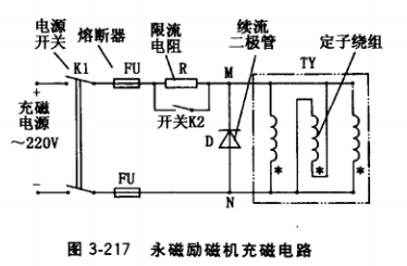 ①接線。如圖3-217所示,把永磁機定子三相繞組任一相反相,然后三相繞組并聯(lián)連接。續(xù)流二極管D用于在切斷充磁電源時,給定子三相繞組儲能提供放電回路,以免繞組產(chǎn)生過電壓而導(dǎo)致定子繞組絕緣損壞。限流電阻 R可用500?1000W電阻爐或同容量燈泡。開 關(guān)K2與電阻R并聯(lián),K2合上時,將電阻R短 路。直流充磁電源經(jīng)開關(guān)K1、熔斷器FU后 接入。