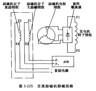②勵磁回路斷線或電氣接觸不良。交流 勵磁機勵磁回路見圖3-225雙點畫線框內(nèi)電 路,包含勵磁機定子主勵磁繞組E1E2、勵 磁機定子復(fù)勵繞組E3E4、AVR輸出端子及 各段連接線。勵磁回路任何一處斷線或電氣 接觸嚴(yán)重不良,都導(dǎo)致勵磁電流無通路,發(fā) 電機不能發(fā)電。