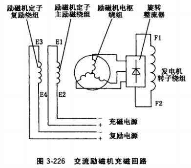 充磁電路見圖3-226。充磁電源正端“ + ”接 定子主勵繞組線端E1,負(fù)端“-”接定子主 勵繞組線端E2,不可接錯。