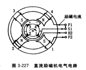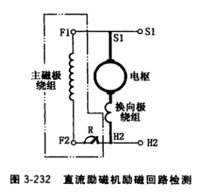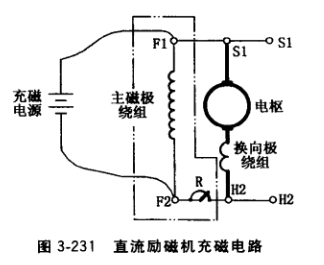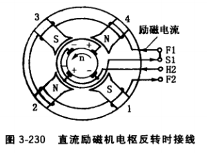 ①改正發(fā)電機電樞轉(zhuǎn)向,或在出線盒上對調(diào)F1和F2 的接線位置。也可按圖3-230接線,即S極下電刷(變?yōu)?負(fù)極性)電纜引出端接H2, N極下電刷(變?yōu)檎龢O性) 電纜引出端接S1。