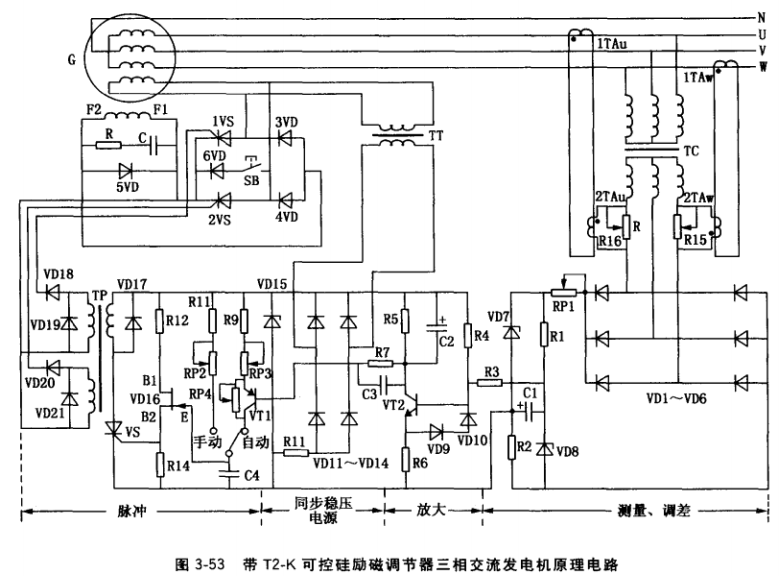 (2)原因分析。由于無(wú)刷發(fā)電機(jī)交流勵(lì)磁機(jī)的勵(lì)磁功率小,勵(lì)磁調(diào)節(jié)器通常使用單結(jié)晶體管觸發(fā)電路(見(jiàn)圖3-53),因此上述現(xiàn)象主要是由于可控硅勵(lì)磁調(diào)節(jié)器故障所致。