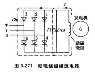 (2)原因分析。可控硅勵(lì)磁調(diào)節(jié)器的續(xù)流管開(kāi)路 或通態(tài)正向電阻變大,脈沖突然消失,可控硅維持電流太小,正向阻斷電壓下降。因?yàn)榭煽毓枵鳂虻呢?fù)載——發(fā)電機(jī)轉(zhuǎn)子是個(gè)大電感,通過(guò)它的電流是不能突變的。發(fā)電機(jī)運(yùn)行中,當(dāng)可控硅整流橋輸出的電壓過(guò)零時(shí),轉(zhuǎn)子將產(chǎn)生一個(gè)與勵(lì)磁電壓極性相反的反電勢(shì),通過(guò)續(xù)流管VD和二極管及未關(guān)斷的可控硅(如 W相二極管3和可控硅6)續(xù)流(如圖3-271虛線所示),續(xù)流電流I=I1+I2。在正常情況下,由于續(xù)流管的通態(tài)正向電阻小,續(xù)流電流基本上從續(xù)流管通過(guò),流過(guò)二極管和未關(guān)斷可控硅的續(xù)流電流I2很小。但若續(xù)流管開(kāi)路或通態(tài)正向電阻大,則續(xù)流電流全部或大部分從W相可控硅流過(guò)。當(dāng)續(xù)流電流I2大于可控硅的維持電流時(shí),可控砘將繼續(xù)導(dǎo)通.直至U相可控硅導(dǎo)通, 強(qiáng)迫其換相才能關(guān)斷。但此時(shí)若三相脈沖(或U相脈沖)突然消失,則W相可控硅關(guān)不斷,將一直導(dǎo)通到承受來(lái)自電源的正向電壓,接著全導(dǎo)通。如此循環(huán),使可控硅完全失控, 成為不可控整流。
