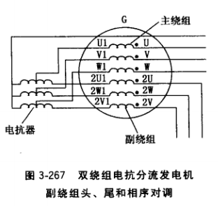 ①改變主、副繞組的相位,減弱相補(bǔ)償作用,使發(fā)電機(jī)外特性變軟,以適應(yīng)并列運(yùn)行。常見(jiàn)的接線方法有:一是將副繞組的頭、尾對(duì)調(diào),如圖3-266所示。此種接法,并列運(yùn)行時(shí)無(wú)沖擊電流,有功轉(zhuǎn)移正常,但無(wú)功輸出小,cosφ只能在0.95?1變化,且cosφ減小時(shí)發(fā)電機(jī)端電壓下降快,起動(dòng)大容量電動(dòng)機(jī)困難,單機(jī)運(yùn)行不好;二是將副繞組頭、尾和相序調(diào)換,如圖3-267所示。此種接法,并列運(yùn)行無(wú)沖擊電流,無(wú)功功率轉(zhuǎn)移正常,cosφ能在0.5?1變化,運(yùn)行良好。由于主、副繞組相位變化,會(huì)使勵(lì)磁電流增大,電壓上升,需適當(dāng)調(diào)節(jié)電抗器氣隙及匝數(shù)比, 調(diào)節(jié)得當(dāng)能使cosφ=0. 7?0.9時(shí),電壓調(diào)整率接近或等于±5%。但在cosφ減小時(shí),電壓下降快,單機(jī)運(yùn)行不好。