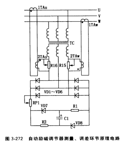 (2) 原因分析。可控硅勵(lì)磁調(diào)節(jié)器為了使發(fā)電機(jī)在并網(wǎng)運(yùn)行時(shí)能合理分配無(wú)功,一般都 設(shè)有調(diào)差裝置,在接線上有單相調(diào)差、兩相調(diào)差和三相調(diào)差等。下面就以兩相調(diào)差為例說(shuō)明接線錯(cuò)誤引起無(wú)功電流一直上升的原因。圖3-272是勵(lì)磁調(diào)節(jié)器的測(cè)量、調(diào)差環(huán)節(jié)(調(diào)節(jié)器電路見(jiàn)圖3-53) 測(cè)量變壓器TC和測(cè)量橋VD1?VD6等組成了調(diào)節(jié)器的電壓測(cè)量環(huán)節(jié)。當(dāng)發(fā)電機(jī)電壓上升時(shí),測(cè)置橋輸出信號(hào)增大,此信號(hào)與比較橋(由R1、R2和VD7、VD8組 成)比較和放大器放大后,將使觸發(fā)脈沖后移,勵(lì)磁電流減小,從而使發(fā)電機(jī)電壓下降,恢復(fù)到接近原來(lái)的電壓值。相反,將使發(fā)電機(jī)端電壓增加,以維持發(fā)電機(jī)端電壓在一定范圍內(nèi)。
