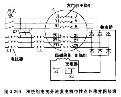 ②減弱相復(fù)勵(lì)作用。其方法有:減少電抗器一次繞組L1的匝數(shù)或增加二 次級(jí)繞組L2的匝數(shù),也可采用中性點(diǎn)外移法并網(wǎng),其接線如圖3-269所示。 操作方法如下:合上開(kāi)關(guān)Q2,分開(kāi)開(kāi)關(guān)Q1,使發(fā)電機(jī)滿足準(zhǔn)同期并網(wǎng)條件, 并使發(fā)電機(jī)電壓高于電網(wǎng)電壓3?5V。 然后打開(kāi)開(kāi)關(guān)Q2,合上開(kāi)關(guān)Q1,按準(zhǔn) 同期并網(wǎng)方法并網(wǎng)(即并網(wǎng)時(shí)不投入電 流復(fù)勵(lì))。最后打開(kāi)關(guān)Q1,合上開(kāi)關(guān)Q2.向電網(wǎng)送電。