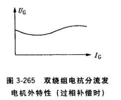 (2)原因分析。雙繞組電抗分流發(fā)電機(jī)一般副繞組滯后主繞組電角度10°,相補(bǔ)償作用強(qiáng),使發(fā)電機(jī)的外特性(即發(fā) 電機(jī)電壓UG隨電流IG變化的特性)下凹上拱,如圖3-265所示。而不同發(fā)電機(jī)的外特性不一致,又無(wú)調(diào)差裝置供調(diào)節(jié)用,因此造成并列運(yùn)行無(wú)功輸出不穩(wěn),無(wú)功分配困難。