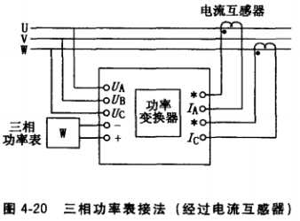 (2)接入三相功率表的三相電壓未經(jīng)電壓互感 器,而直接接到功率變換器,但電流側(cè)經(jīng)過電流互感器再接至功率變換器,如圖4-20所示。這種接法用于測量電壓400V、電流5A以上的大功率。