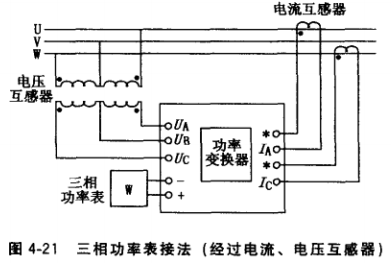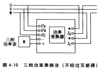 (3)接入三相功率表的三相電壓和電流均經(jīng)互感器,再接至功率變換器.如圖4-21所 示。這種接法只要配上不同變比的電壓、電流互感器,可測任何電壓、電流下的功率。